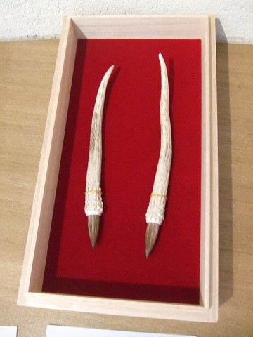 この写真は、奈良公園の1歳の鹿さんの角で作った筆です